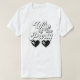 Camiseta de festa de solteira bonita para a noiva que apresenta "Esposa do Partido" em um grande roteiro retrô do estilo 70 e óculos de sol em forma de coração. A coordenação das t-shirts "Life of the Party" está disponível para o grupo de solteiros.