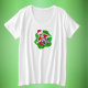 Esta camisa de mulheres do tamanho mais tem um esqueleto bonito vestindo um Papai Noel vermelho segurando dois ornamentos brilhantes com flocos de neve até seus olhos enquanto dentro uma forma brilhante vermelha e verde de esplendor.