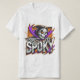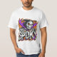 Esta design vibrante mostra um personagem esquelético malicioso emergindo do texto ousado e estilizado "SPOOKY". O esqueleto, com um sorriso largo e olhos expressivos, veste uma capa roxa dramática que corre ao redor de seus ombros, aprimorando seu comportamento estranho, ainda que brincalhão. O texto é renderizado em branco dinâmico com bordas irregulares, cercado por um contorno laranja e roxo marcante que adiciona profundidade e energia à composição geral. A mistura de cores e elementos do estilo cômico torna este design perfeito para um tema do Dia das Bruxas, incorporando uma sensação de diversão e medo.