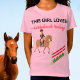 Esta Menina ama Horseback Riding design - tem uma garota bonita no cavalo andando em direção a um salto vertical de cavalo com caixas de flores embaixo, como você vê no show ring!