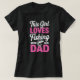 Esta design apresenta uma camiseta preta com o texto "This Girl" no topo. Abaixo de "This Girl" está a palavra "LOVES" em uma fonte rosa estilizada. Em "LOVES" está a palavra "Pesca", também a rosa. Abaixo de "Pesca" está o texto "COM" acima de "HER" e "PAI", tudo a rosa. A design inclui um gráfico de um peixe.