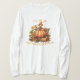 Um espantalho sente-se bem em casa, em um manto de abóbora com girassóis, winterberry e pinecones.