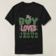 Esta camiseta preta apresenta a palavra "Isto" no topo numa pequena fonte branca. Abaixo, "BOY" é exibido em letras grandes verdes, com um contorno branco e um coração incorporado ao "O". A palavra "LOVES" está escrita em uma fonte vermelha e branca esboçada com dentro de corações pequenos em cada letra. Na parte inferior, "JESUS" está em grandes letras verdes. Esta design expressa o amor de um jovem por Jesus.