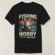 Essa camiseta preta mostra uma ilustração detalhada de uma pessoa que pesca de um barco de madeira em um lago sereno no nascer do sol ou pôr do sol, indicada pelas cores quentes no céu. O texto acima da ilustração diz "FISHING" numa fonte branca grande, em negrito, ligeiramente curvada com um contorno laranja, seguida de "IS NOT APENAS A" numa letra branca mais pequena. Abaixo da ilustração, a palavra "HOBBY" é exibida em uma fonte grande, em negrito, colorida com um contorno laranja, e abaixo dela, "It's a Lifestyle" é escrito em uma fonte menor e colorida com creme. O design geral celebra a pesca como mais do que um passatempo.