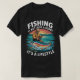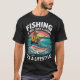 Esta camiseta preta apresenta uma ilustração detalhada de uma pessoa que pesca de um barco e pega uma grande truta colorida. O texto acima da ilustração diz "FISHING" numa fonte branca grande, em negrito, ligeiramente curvada com um contorno laranja, seguida de "IS NOT APENAS A HOBBY" numa letra branca mais pequena. Abaixo da ilustração, "IT'S A LIFESTYLE" é exibido em uma fonte grande, branca, ligeiramente curvada com um contorno laranja. O fundo mostra um lago cênico com um pôr do sol colorido ou o nascer do sol. Esta design salienta a profunda ligação e o empenhamento da pesca como forma de vida.