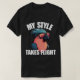 O pássaro tem uma plumagem clara e colorida, principalmente em tons de rosa e azul, com um bico preto. Ela está vestindo óculos escuros grandes e reflexivos com tom rosa, dando-lhe uma aparência moderna e moderna. As penas do pássaro são espetadas num estilo dinâmico e sujo. Ao redor do papagaio está um texto branco e ousado que diz "MEU ESTILO TOMA VOO", enfatizando o comportamento legal e confiante do papagaio.