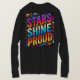 A design da camiseta "Stars Shine Proud" mostra um céu noturno ousado e elevador cheio de estrelas brilhantes, simbolizando orgulho e unidade. Uma estrela central e radiante se destaca, representando individualidade e autoconfiança, enquanto estrelas menores formam um padrão harmonioso ao seu redor. O design usa azuis ricos e amarelos brilhantes, dando uma sensação de calor e otimismo. Perfeito para aqueles que querem expressar seu orgulho e brilhar intensamente em sua singularidade.