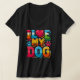 A design da camiseta apresenta a frase "Eu amo meu cachorro" em uma tipografia ousada e brincalhona. A palavra "Amor" é representada por um grande coração vermelho, acrescentando uma vibrante pop de cor. Ao redor do texto estão lindas, pegadas e pequenas ilustrações relacionadas a cães, como ossos e coleiras de cães. A design é simples, quente e perfeita para expressar o afeto de um dono de cachorro em um estilo divertido e casual.