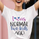 Camisas divertidas para mães com duas (ou mais) crianças com a citação "Eu era normal há duas crianças" em fontes roxas, pretas e azuis modernas. Faz o presente perfeito para mães irônicas no dia de as mães ou no seu aniversário.