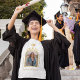 Texto personalizado moderno dourado tipografia e formando que a camiseta segundo grau da faculdade ou da graduação universitária com uma fotografia em forma de arco de tendências e um aspecto na moda.