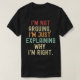 Adicione algum humor ao seu estilo do dia a dia com esta camiseta "Eu não estou discutindo, estou apenas explicando por que estou certo"! Perfeito para quem tem personalidade espirituosa que ama um bom debate — ou pelo menos para ganhar um! Esta camisa engraçada faz um presente ideal para amigos, colegas de trabalho, familiares ou qualquer pessoa que desfrute de humor sarcástico e de brincadeiras inteligentes. Quer você esteja indo trabalhar, uma excursão casual, ou simplesmente descansando em casa, este confortável e na moda é certo que fará as pessoas sorrir (e talvez até acenar de acordo!). Disponível em vários tamanhos e cores para se adequar a cada humor e ocasião. Excelente por: Um presente engraçado para ele ou para sua camiseta sarcástica amadora humor de escritório e colegas Debaters e amigos opinativos Todos os dias visto casual Pegue o seu agora e deixe o mundo saber — você não está discutindo, você está sempre certo!