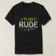 Esta imagem exibe uma camiseta preta com uma instrução impressa em letras verdes e brancas. A frase "-IM NOT-" aparece acima da palavra "RUDE" em uma fonte maior e esboçada. Abaixo de "RUDE", as palavras "I'm Real" são escritas em uma escrita cursiva. O design transmite uma atitude simples e talvez um pouco rebelde.