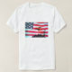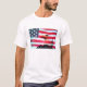 Um logotipo da bandeira americana está na parte dianteira da camisa na bandeira lá é uma águia americana, que seja nosso pássaro das nações. na parte traseira diz que "eu sou orgulhoso ser um americano"