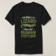 Uma camiseta humorística com um lagarto. Este design diz que "EU SOU REALMENTE UM LAGARRO. ESTE É O MEU CUSTO HUMANO."