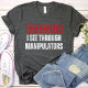 Camiseta Eu Vejo Através De Manipuladores, Mansplanície, Fe