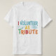 O design de t-shirt declara ousadamente "I Volunteer as Tribute" num esquema multicolorido. As cores variadas acrescentam um elemento dinâmico à mensagem, mostrando sua bravura e disponibilidade para se destacar.