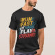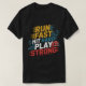 Esta t-shirt preta apresenta o texto "RUN FAST HIT DURO PLAY STRONG" numa fonte estilizada. As palavras são empilhadas verticalmente, com "RUN FAST" em amarelo, "HIT DURO" em azul e "PLAY STRONG" em vermelho. Os elementos gráficos incluem calçados corridos, um hélice e um capacete de futebol, sugerindo esportes e atlética.