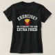 Exercício? , Oh I pensou que você disse fritadas do acréscimo! A camisa divertida é grande para as mulheres que deiam elaborar no gym e amam comer batatas fritas e petiscos do fast food! Fundo escuro com rotulação e o recipiente brancos de fritadas saborosos.