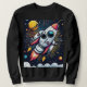 Uma nave de foguetes retrô se transforma em um cosmos colorido e estrelado. É desenhado brincalhão com grandes olhos e um rosto amigável, adicionando um toque de chorona à cena. A trilha de exaustão do foguete e os planetas vibrantes ao fundo criam um sentido de movimento dinâmico e aventura.