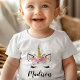 Faça a sua pequena se sentir como mágica com esta camiseta encantadora de unicórnio personalizada! Com uma carinha de unicórnio fofa com detalhes cintilantes em dourado e uma coroa de flores, esta camiseta é perfeita para meninas que amam tudo o que é mágico. Personalize com o nome da criança para criar um presente único e super especial.