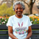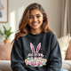 Esta camisa de Páscoa encantadora apresenta adoráveis orelhas e pés de coelhinho, cercados por ovos coloridos de Páscoa e confete festivo. O texto "Eu sou a Avó Coelhinha" pode ser personalizado para qualquer membro da família, fazer-o perfeito para criar um conjunto divertido. Ideal para comemorações de Páscoas, caçadas de ovos ou fotos da família, esta camisa é um presente excelente para avós, pais, filhos e irmãos compartilharem o espírito de feriado!