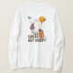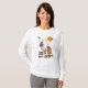 A camisa divertida do Halloween tem uma criança vestida como um fantasma com meias listradas e carregando algumas flores roxas. Ao lado dela estão duas abóboras empilhadas com uma flor roxa no topo. Os morcegos voam sobre a lua de cheio laranja do Dia das Bruxas e as estrelas estão brilhando. Disponível em tamanhos de criança para adultos.