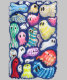 Um grupo de fantasmas brancos e coloridos preenche o espaço, Cada figura é única, apresentando diferentes padrões e matizes que fornecem um contraste lúdico e vibrante. O efeito geral é animado e imaginativo, evocando uma sensação de diversão e mistério.