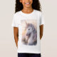 A camiseta de uma garota com um monocórnio majestoso com um homem fluente banhado em iluminação gentil e etérea, evocando um senso de magia e tranquilidade.