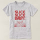 Aproveite a camiseta do amante de pizza. Grandes letras vermelhas em negrito com pizza de desenho animado. A citação diz "SLICE SLICE BABY!"
