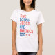 Esta vibrante design de camiseta apresenta uma mensagem ousada e patriótica que combina fé e orgulho nacional. O texto diz, "ELA AMA JESUS E AMÉRICA TAMBÉM", enfatizando a devoção tanto às crenças religiosas quanto à nação. As alternantes cores vermelha e azul evocam a bandeira americana, enquanto a tipografia angustiada acrescenta um toque robusto e sincero. Perfeito por expressar amor por Jesus e América com estilo e convicção.