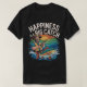 Esta camiseta preta apresenta uma ilustração animada de um homem barbudo vestindo um chapéu de pesca e colete, alegremente enchendo-se de um peixe grande e colorido. Acima da ilustração, o texto "FELICIDADE É A" é escrito em caracteres brancos curvos e, por baixo, "GRANDE CAPTURA" é apresentado em caracteres brancos maiores e curvos. O fundo mostra um pôr do sol estilizado sobre um corpo azul de água. Esta design sugere brincadeira que pegar um peixe grande traz felicidade.