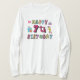 Feliz aniversário de 7. Design de aniversário engraçado e fofo com um lindo ursinho de pelúcia segurando um presente e um lápis engraçado escrevendo os desejos de aniversário. Uma combinação perfeita para roupas, camisas e acessórios.