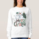 Design de camiseta de Natal festiva, com dois bonitos bonitinhos de neve, uma árvore de Natal decorada com uma estrela no topo, colorida texto "Feliz Natal", e flocos de neve