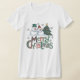 Design de camiseta de Natal festiva, com dois bonitos bonitinhos de neve, uma árvore de Natal decorada com uma estrela no topo, colorida texto "Feliz Natal", e flocos de neve