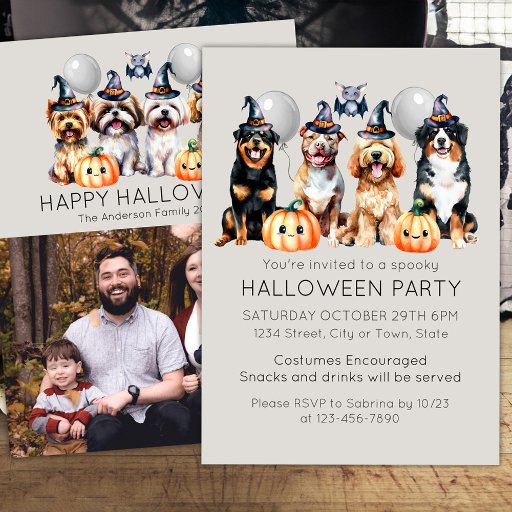 Um design moderno Feliz Dia das Bruxas com grandes raças de cães; Rottweiler, Touro do Pit, Labradoodle ou Goldendoodle, e um Cão da Montanha Bernês, rodeado de abóboras bonitinhas, um morcego, e balões de cinza.