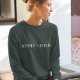 Um suéter de Natal moderno na moda, com uma tipografia ousada, que diz "Feliz + Brilho", em branco, com uma cor verde de floresta escura. A saudação pode ser facilmente personalizada para um toque pessoal. Um design de natal moderalista e contemporâneo para sair dessa temporada de festas! #natristmas #merryandbright
