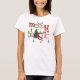 Feliz e Natal brilhante em letras vermelhas e verdes com ornamentos retrorreflectores, árvore de Natal e galhadas.