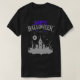Uma camisa do "Feliz Dia das Bruxas 2023", com um design cativante com letras pretas e roxas, uma lua de cheio, uma igreja assustadora, e morcegos voadores, estabelece o palco para uma celebração festiva e inquietante do feriado.