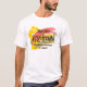 Moderna e feliz JUNETEENTH, T-Shirt cristã unisex. A design mostra traçados de tinta em vermelho, laranja e verde, com fundo de traçados vermelhos, amarelos e verdes com efeito de rotação e punho de força amarelo. O texto diz FELIZ JUNETÉNIA - CELEBRE A LIBERDADE DE CRISTO. Este dia 11 de junho seria um presente excelente para quem quer celebrar este feriado da independência negra africana americana e também partilhar a mensagem cristã da liberdade em Jesus Cristo.