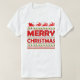 Esta camiseta branca apresenta um design imitando um suéter de Natal tradicional. As palavras "MERRY CHRISTMAS" aparecem em vermelho, rodeadas de padrões festivos, incluindo renas, árvores de Natal, flocos de neve e formas geométricas em vermelho, verde e ouro. Acima do texto, Papai Noel, no trenó puxado por renas, é representado em uma silhueta vermelha.