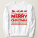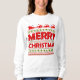 Esta camisola branca apresenta um design imitando um suéter de Natal tradicional. As palavras "MERRY CHRISTMAS" aparecem em vermelho, rodeadas de padrões festivos, incluindo renas, árvores de Natal, flocos de neve e formas geométricas em vermelho, verde e ouro. Acima do texto, Papai Noel, no trenó puxado por renas, é representado em uma silhueta vermelha.
