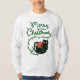 Design de "Feliz Natal" com um gato preto giro embrulhado em luzes de Natal coloridas enquanto abraçava um ornamento vermelho. Perfeito para amantes de gatos celebrarem o feriado de forma divertida e caprichosa.