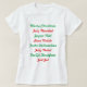 Está aqui uma camisa para pôr o no espírito do Natal em muitos países. Caracteriza o cumprimento "Feliz Natal" em espanhol, francês, italiano, alemão, português, holandês, norueguês/sueco--assim como o inglês. O texto está em um festiva, a pia batismal do roteiro que alterna entre verde e o vermelho.