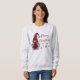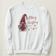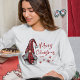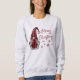 Camisa de suor feminina, de férias, ao estilo russo, com "Feliz Natal" e o ano em roteiro de caligrafia vermelho-na moda. Esta design única apresenta um gnomo de uma dama em sua roupa de feriado de xadrez de búfalo vermelha com chapéu e acentuado por estrelas de floco de neve.