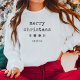 Esta camisola preta e branca, na moda, apresenta texto de máquina de escrever que diz "Feliz Natal", com um grupo de flocos de neve de feriado e um ponto para o seu nome.