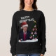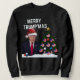 Feliz TRUMP'MAS natalícia Sweatshirt American Flag Ornament American Christmas Tree Ouro Star and Eagle. Trump vestindo um Papai Noel e Feliz Natal feito em Branco, Neve ao fundo.