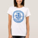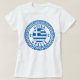 Camiseta feminina Hydra, Grécia com a Bandeira Nacional da Grécia dentro de um círculo de padrão grego antigo. Aproveite usar esta camiseta enquanto estiver de férias na bela ilha de Hydra ou dê como lembrança de presente.