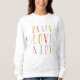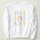 Camiseta ou camisola de férias personalizada com design de tipografia química. Texto diz Paz Amor e Joy em cores brilhantes.