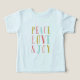 Camiseta de férias personalizada com design de tipografia caprichosa. Texto diz Paz Amor e Joy em cores brilhantes.