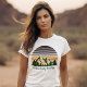 Personalize as camisas femininas da sua própria família para viajar na natureza este verão ou outono. Personalize com o seu sobrenome debaixo da floresta verde de árvores e pôr do sol da montanha escura para manter férias legais para o seu grupo ao ar livre.